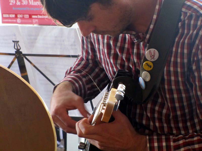 This was a larger, 5-piece Spartak. I’ve written here of Spartak as a duo. The essence of drums/percussion and processed instrumental sounds was still there, but this was bigger and more exploratory. The first tune was indicative of the approach and structure. Evan started by setting percussion rhythms. Tim introduced a simple melodic line on trumpet, repeating with some small variations. Andrew played mostly harmony notes. He once inserted a snippet of modern jazz (lovely) but returned to simpler harmony notes, which are a better base for Schoeb’s digital manipulations. These digital sounds formed an intense and all-encompassing background for snippets of notes and varied percussion until Tim restated his simple melody and the tune ended. Guitarist Morgan was also there with few notes but extended effects. I couldn’t identify his part, although Shoeb was obviously clear on his space. It’s music that has its own logic and art and it demands intense contemplation. I find it rewarding although the passers-by at the Street seemed a bit non-plussed. I found the clarity and strength of the trumpet was perfect to cut through the environmental noiseworks and also as a base for these manipulations. I also noticed the tunes grew and fell away (obvious enough) and interestingly it was the human sounds that made growth and the digital sounds that accompanied the decay. Not sure I can read any more into this than that the digital followed the instruments, but maybe it’s a comment on our human progress? Growth as a search for harmony, tonality, melody, structure; digital as mechanical, intervened, under human control but not human. The second piece first had me amused with shades of scifi: R2D2 and, more profoundly, Forbidden Planet. Again, the trumpet set intervals and the alto found harmonies, and the electronics bent and repeated these sounds and fed them back amongst a clatter of rhythm. These are not easy sounds, but they are satisfying.