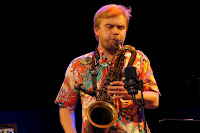 They didn’t take themselves too seriously given plenty of sly chuckles and smiles, but this was out there and as serious as your lives. I guess some improvisation was free but there were clear written parts, complex unison or harmonised lines with intervals that most wouldn’t find, neat counterpoint when Mikko accompanied on baritone sax, fluid melodicism from both the horns but plenty of frenetic excess too. The skills and chops and beauty were clear in sinuous tenor or alto but so were the escapes to extremes of noise and strange superabundant beauty. The keyboard, too, was mostly extreme, seldom pianistic but UFO-logical, groovy with funk rhythms and bluesy-tinged solo development at times and whimsical with sampled sounds and one sampled R&B woman’s voice for the funk number. The drums were a ring-in for the night, but with Mikko’s brother-in-law so not unknown to the band. This was extreme and madly skilled and funky and fun and sometimes touching music (“Where did you go, John [Tchicai]”) but never indulgent and always in touch. Wow and world class to my ears. Innkvisitio are from Finland and were led by Mikko Innanen (alto, tenor, baritone saxes) with Fredrik Ljungkvist (tenor sax, clarinet), Seppo Kantonen (synth) and visitor Stefan Pasborg (drums).