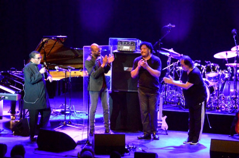 Herbie played Korg Kronos and a fabulously forcefully-miced grand piano and a Roland keytar. it looked like Lionel played guitar but the solos sounded like synth (I had to look twice at his first solo) with perhaps traditional guitar sounds coming through quietly in chordal acompaniment. Nary a pick passed his fingers: this was all fingered chords and single notes. James was busy, bassy and a little bass-endy and lost in the mix (at least from where I sat) until he took to soloing where his sound was eminently bell-like clear, playing mostly finger style, but also thumbs or classical-like finger style. Then Vinnie, solid and strong, not overly polyrhythmic if more adventurous in solos (two) which featured some incredibly challenging ostinatos an stabs from the band. Lionel did several solos with loops, richly complex, and accompanied by his voice in harmonised. Herbie did vocoder voice, too, that strangley otherworldly vocal sound. James blew out everyone with another stunning looped solo and his other was no work of slouch. Various tunes form Herbie's history appeared for a line or two through the concert, then diffused into grooves, perhaps to reappear and diffuse again. The Headhunters era featured, but there were others too, better recognised by others of the jazzer family who attended. But it was a full house and there aren't so many jazzers in Canberra, so there were lots of unknown faces with a few jazz regulars amongst the crowds. They were all impressed. Two promised to burn their instruments next day (hopefully the instruments have survived). Suffice to say, this was a lesson in strength and power, complexity and familiarity, richly arranged but still open and fresh. A blast.Herbie Hancock (keys, vocals) played the Canberra Theatre with Lionel Loueke (guitar, vocals), James Genus (bass) and Vinnie Colauita (drums).